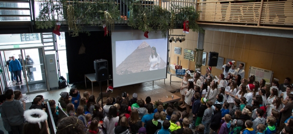 Wie man sehen kann, haben auch die fleißigen Helfer unter jeden Stuhl geguckt. 😉 Aber nein, keine Spur vom Nikolausi. Der tauchte dann erst zur Großen Pause auf. Was er so getrieben hat und warum er so spät war, konnten wir ja alle im Nikolausfilm bewundern. Anschließend gab es noch den traditionellen „Lehrer vs. Schüler“-Wettkampf, in dem die Teilnehmer in verschiedenen Disziplinen um Schokopreise kämpften. Nach ein paar Partien Skateboardziehen, Ich packe meinen Koffer, Schokoladeangeln und anderen Spielen haben die Lehrer knapp 3:2 gewonnen.