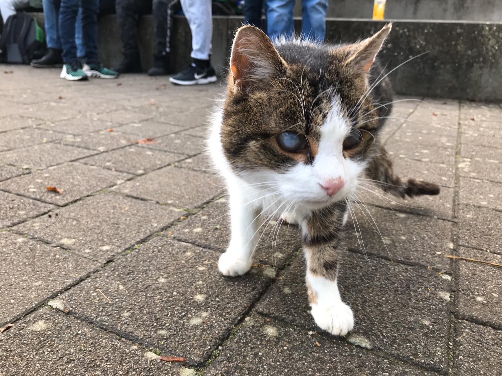 Ihr alle habt bestimmt schon mal den Kater gesehen, der seit ein paar Jahren auf dem Schulgelände herumstreunt. Er streifte umher und suchte ständig nach Futter, fraß aus dem Mülleimern, was er finden konnte und manchmal gaben ihm Schüler auch etwas zu fressen. Diese Woche jedoch, als die erste Kälte kam, schien es dem kleinen Kerl nicht sonderlich gut zu gehen. Das rechte Auge war schon trüb, das linke trübte auch ein. Da es immer kälter wurde und er nicht den Eindruck machte, das zu überleben, war es also an der Zeit, ihn einzufangen.