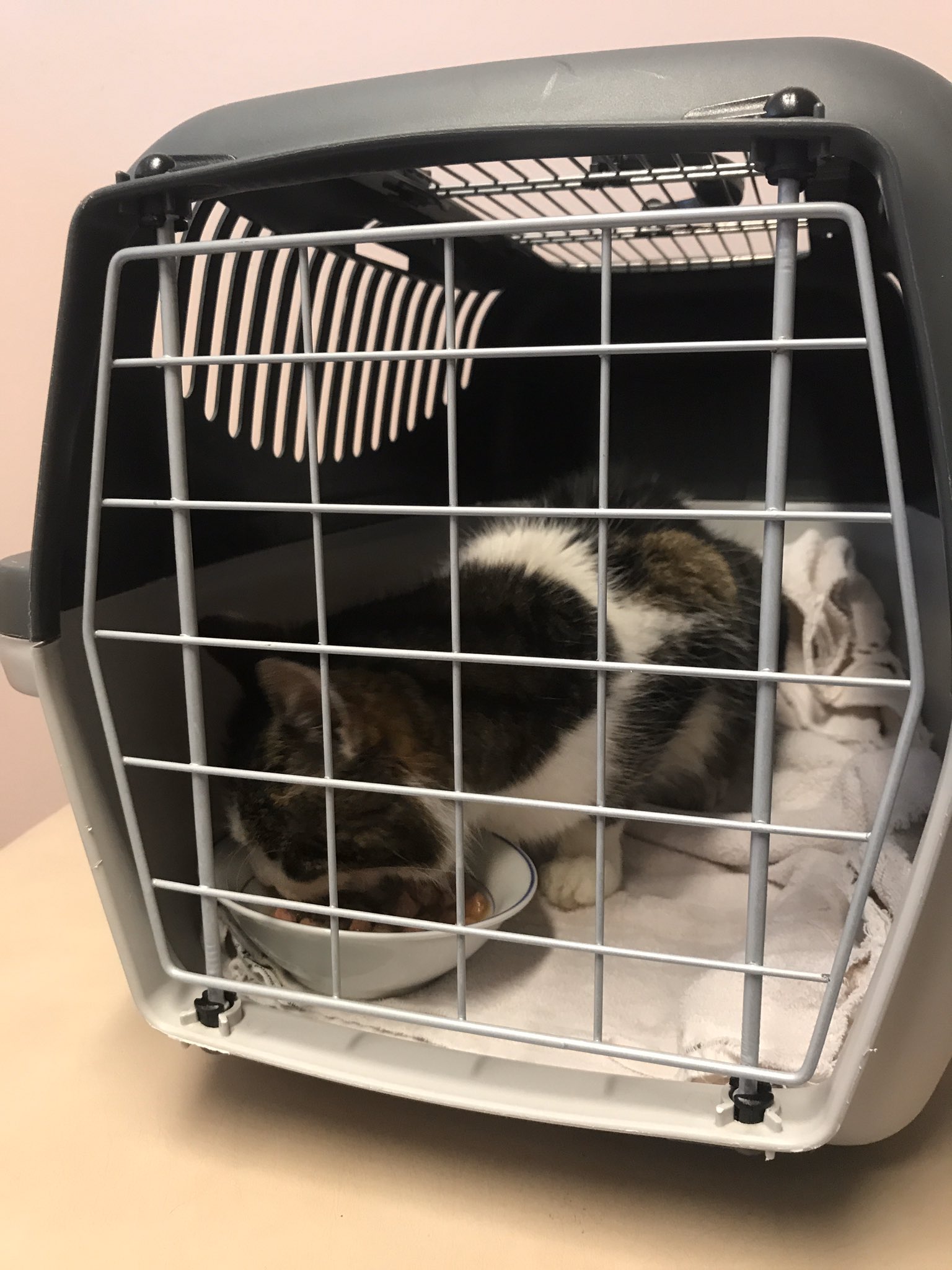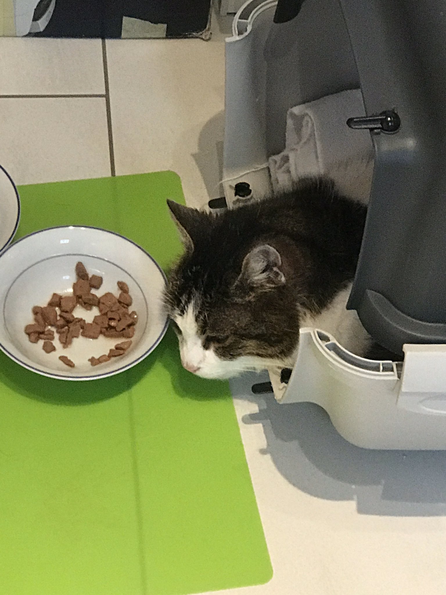 Am Mittwoch konnte er mithilfe von ein paar sehr netten Schülerinnen (danke an Luba und Sarah!) eingefangen werden. Im warmen, gemütlichen Krankenzimmer hatte er seine Ruhe und verschlag drei Pack Katzenfutter. Er war scheu, kein Wunder, aber nach etwas Ansprache und Streicheleinheiten fing er an, laut zu schnurren. Ein gutes Zeichen. Zwischenzeitlich wurde auch ein Termin in der Tierklinik Ravensburg vereinbart. Um 16.45 Uhr würde man herausfinden, was dem Kleinen fehlt und wie es dann weitergeht. Nach dem Schultag verbrachte der Kater den Nachmittag gut umsorgt und im Warmen bei einer Lehrerfamilie. Die Fußbodenheizung hatte es ihm besonders angetan und tat ihm auch sehr gut. Nach drei weiteren Portionen Katzenfutter schlief er ein. Kein Wunder, bei dem anstrengendem Tag.