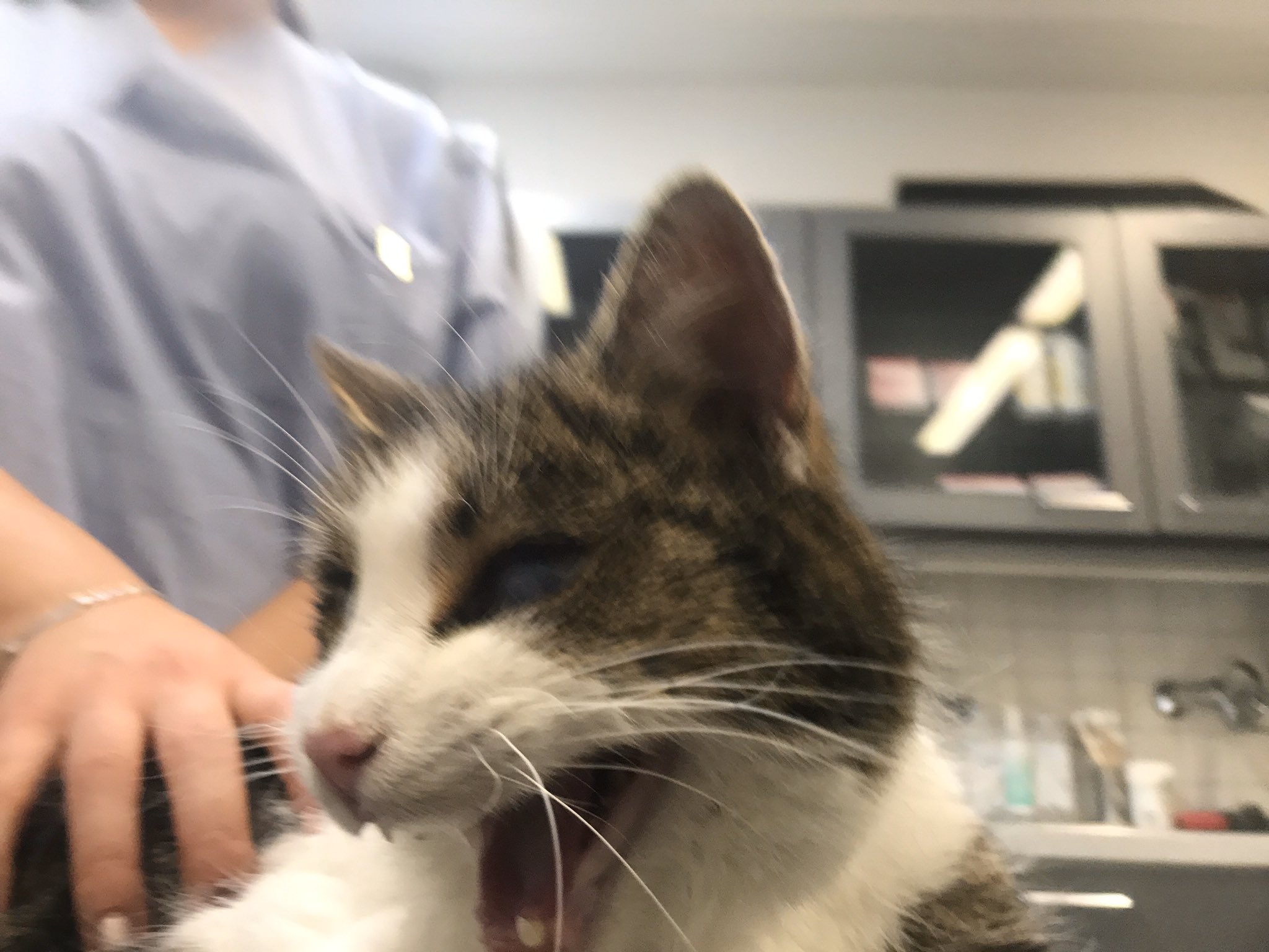 Auf dem Weg zur Tierklinik Ravensburg schlief er weiter, trotz anfänglicher Aufregung. Die Untersuchungen der Tierärztin ergaben Folgendes: Er ist wohl schon ein „älteres Semester“ und ist kastriert, aber weder verchippt, noch tätowiert. Er ist unterernährt und hat dadurch Untergewicht. Herz und Lunge sind in Ordnung, jedoch hat er Katzenschnupfen. Das Gewebe des rechten Auges ist wahrscheinlich vernarbt, das linke Auge ist trüb, weil er unter chronischen Herpes leidet, der gerade wieder wegen Stress ausgebrochen war.