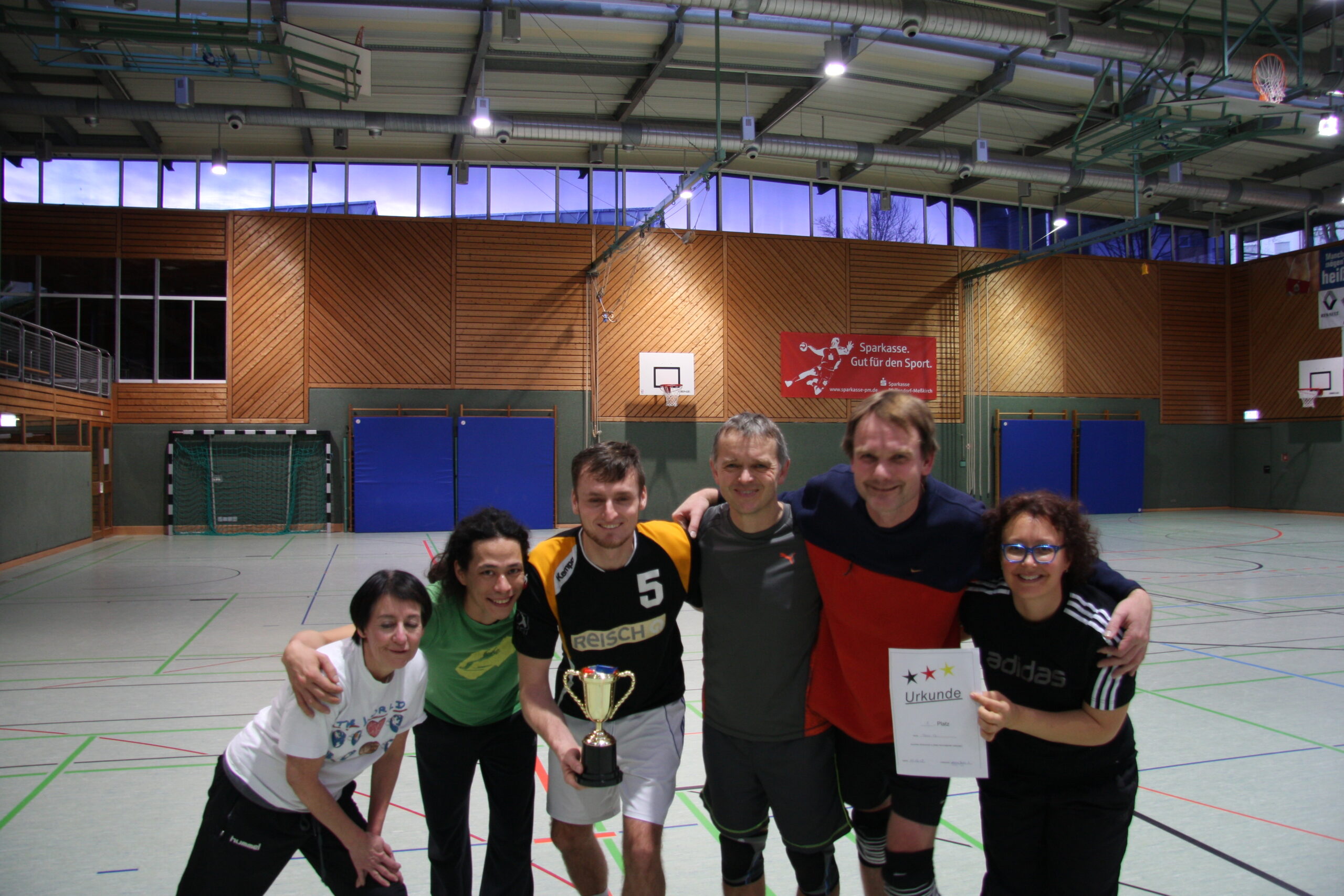 Während sich die Reihen langsam leerten, kam es zum Showdown: nur wenige Hardcore-Fans und Busverpasser schauten beim Halbfinale zu, in dem die Sport-4-Stünder gegen die beiden Lehrerteams ihr bestes gaben, jedoch nicht mit dem regelmäßigen Training der Lehrer rechneten und somit nur auf den 3. Platz kamen. Im finalen Spiel wurde aus dem Schulturnier also ein Lehrerturnier und die knappen Gewinner sind Team 13, bestehend aus Frau Maier, Herr Kilian, Herr Zimmerer, Herr Linster, Herr Rettich und Frau Barth – Herzlichen Glückwunsch an dieser Stelle !