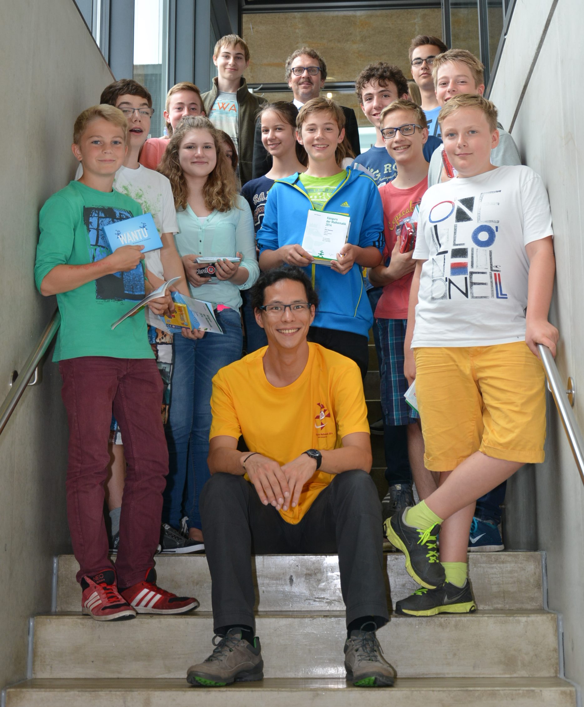 Der stellvertretende Schulleiter Achim Prinz (hinten) übergab zusammen mit dem zuständigen Mathematikfachkollegen Klaus Kilian (vorne) die Preise für die 17 Gewinner des Staufer-Gymnasiums im Känguruh-Wettbewerb und spendierte zusätzlich eine kleine Abkühlung. Über 880.000 Schülerinnen und Schüler aus mehr als 10.000 Schulen waren beim 20. Känguru-Wettbewerb dabei, darunter 190 Schüler unseres Gymnasiums.