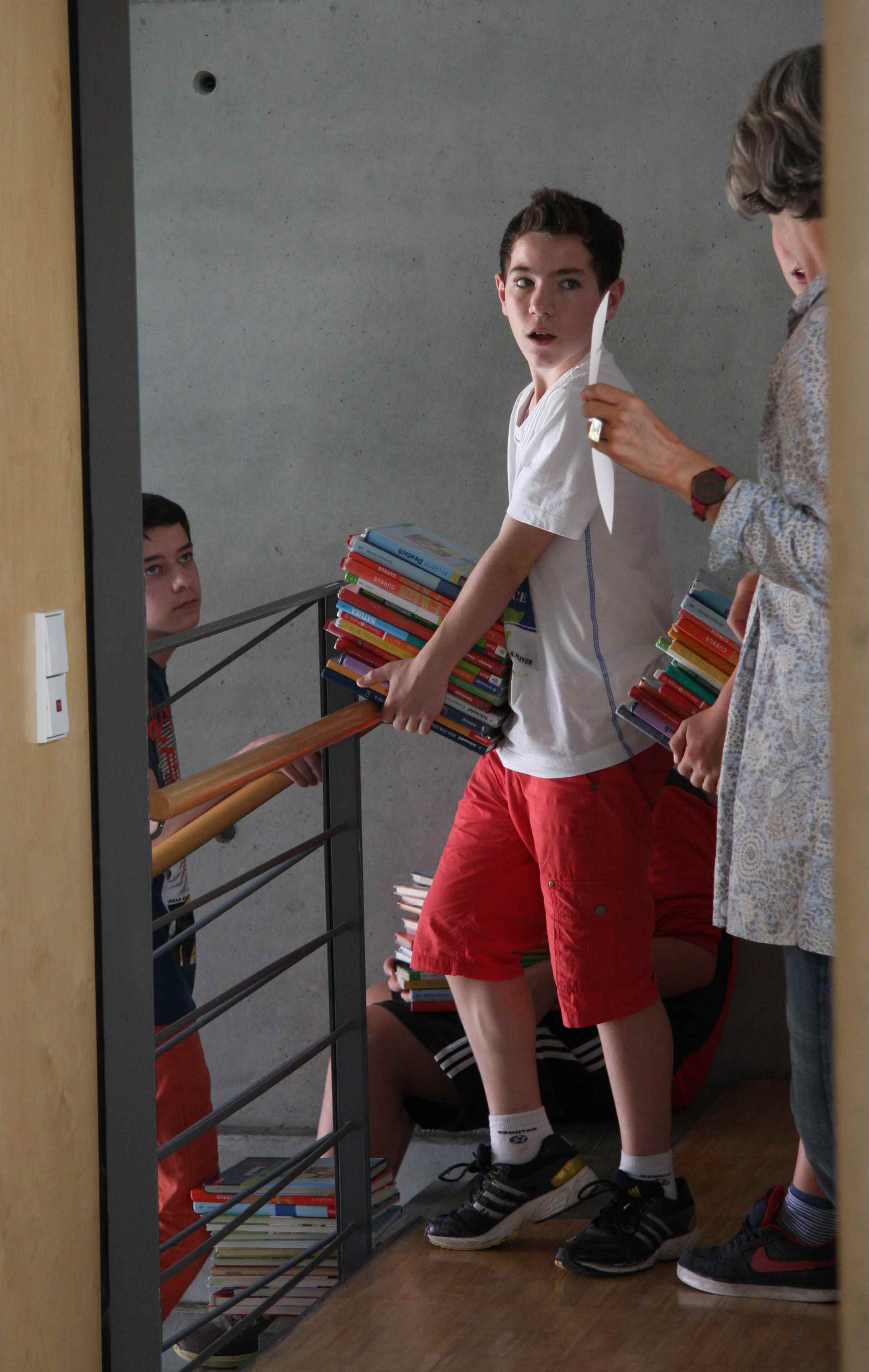 Die Schülerinnen und Schüler werden mit ihren neuen Büchern nicht mehr zur Brücke durchgelassen, sondern über den hinteren Treppenaufgang hinuntergeschleust. Manche wundern sich und fragen nach…