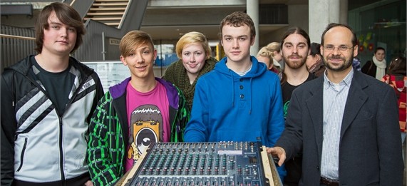 Das Schülerradio, das sind (von rechts) Herr Thorwart, Robin Gerl, Patrick Barthel, Marie Pattberg, Michael Perschke und Maximilian Wildbrett. In diesem Schuljahr wollen sie durch das Spielen von Musik den Schülern den Alltag etwas verschönern.