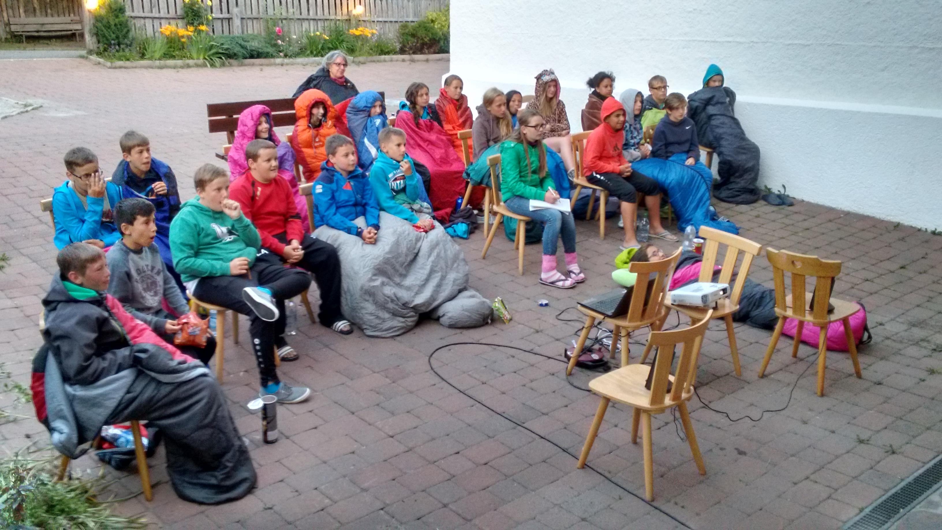 Nach ein paar Runden Wikinger Spiel ging das Open Air Kino los und wir sahen uns „Ich – Einfach unverbesserlich 2“ im Hof an und da es sehr kalt war, saß die ganze Klasse bald in ihren Schlafsäcken auf den Stühlen. Bettruhe war um 23:00 Uhr (nach so einem Tag hat man sich das wirklich verdient – vor allem die Lehrer).